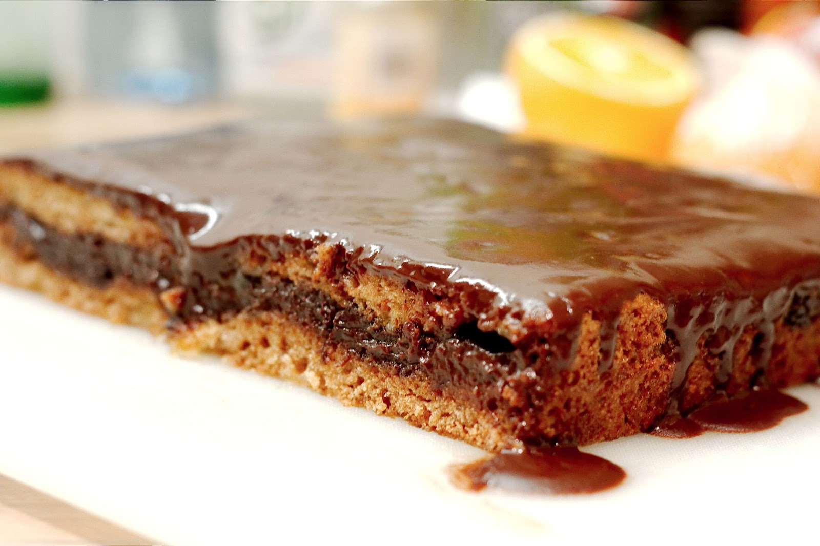 Ha kihült, vonjuk be csokimázzal. Ehhez 40 g vajat olvasszunk fel és dobjunk bele 50 g apróra tört csokoládét. Keverjük el és ha a csoki teljesen felolvadt, már önthetjük is a tetejére. Teljes kihülés után felvághatjuk. Én legközelebb tejszínes ganache-sal vonom majd be, ehhez 50 g tejszínt fel kell forrósítani (de nem forralni!) és 50 g étcsokira ráönteni, jól megkeverni, amíg a csoki teljesen fel nem olvad.