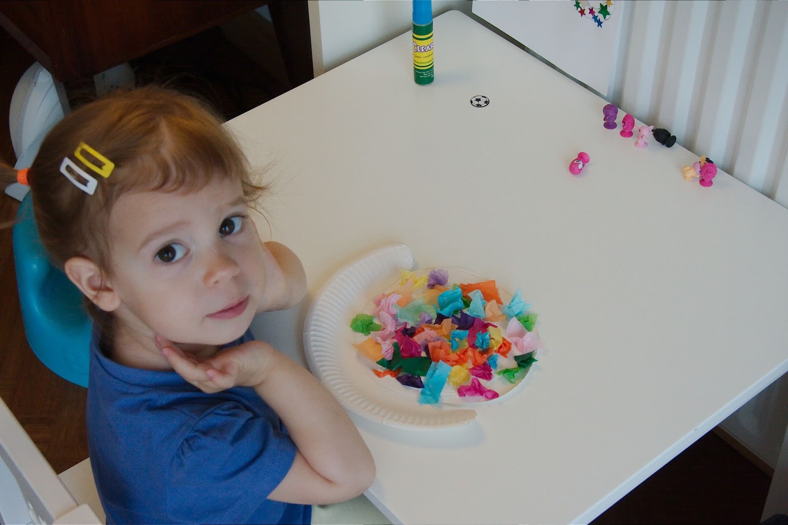 Nóri feltette a csibe szemeit és a csőrét (ehhez nem kell ragasztó, a papír jól tapad az ujjfestékre). Végül megformáztam a zseníliadrótokat és rögzítettem a tányérhoz.