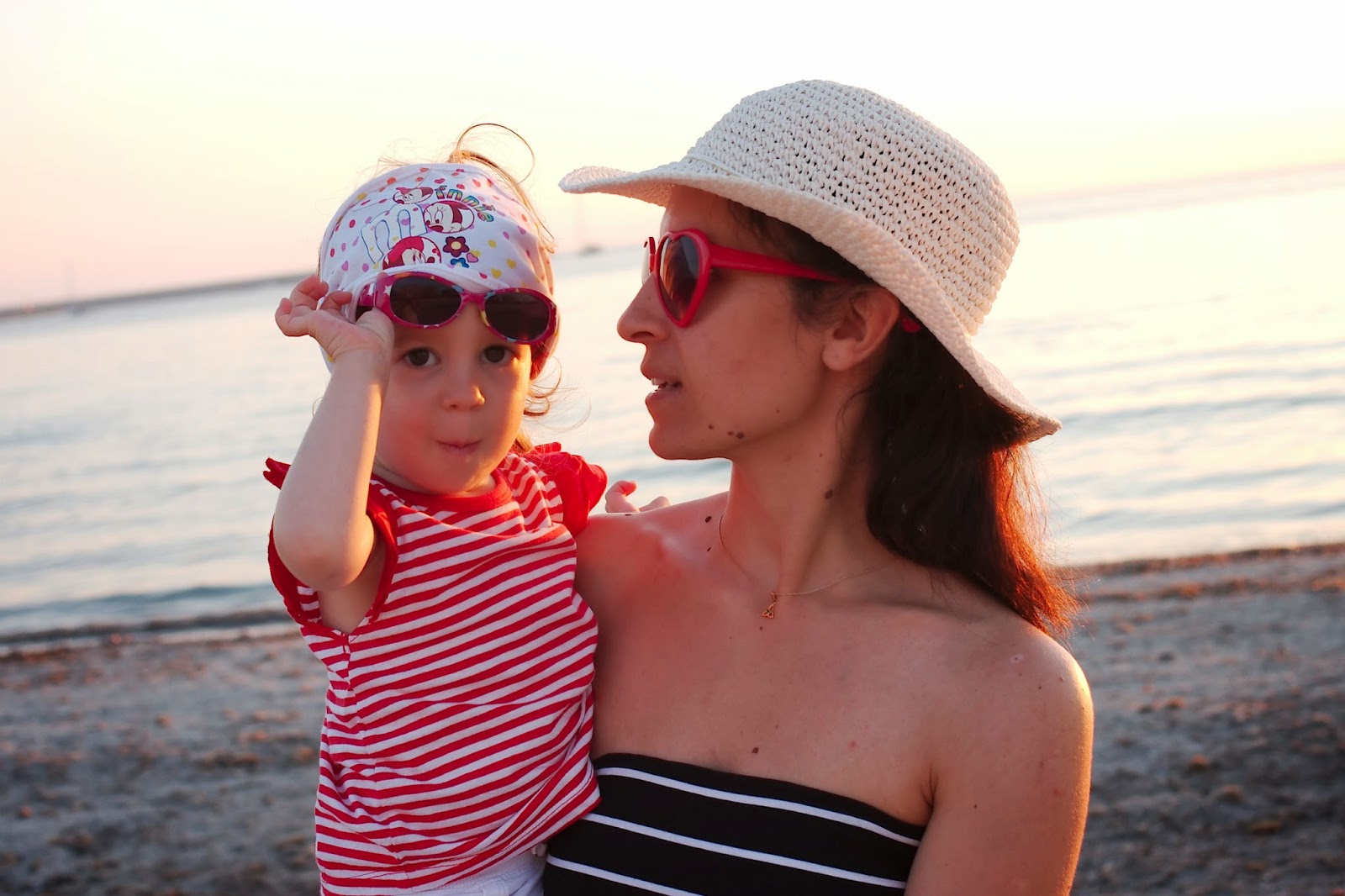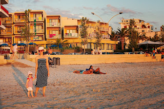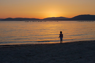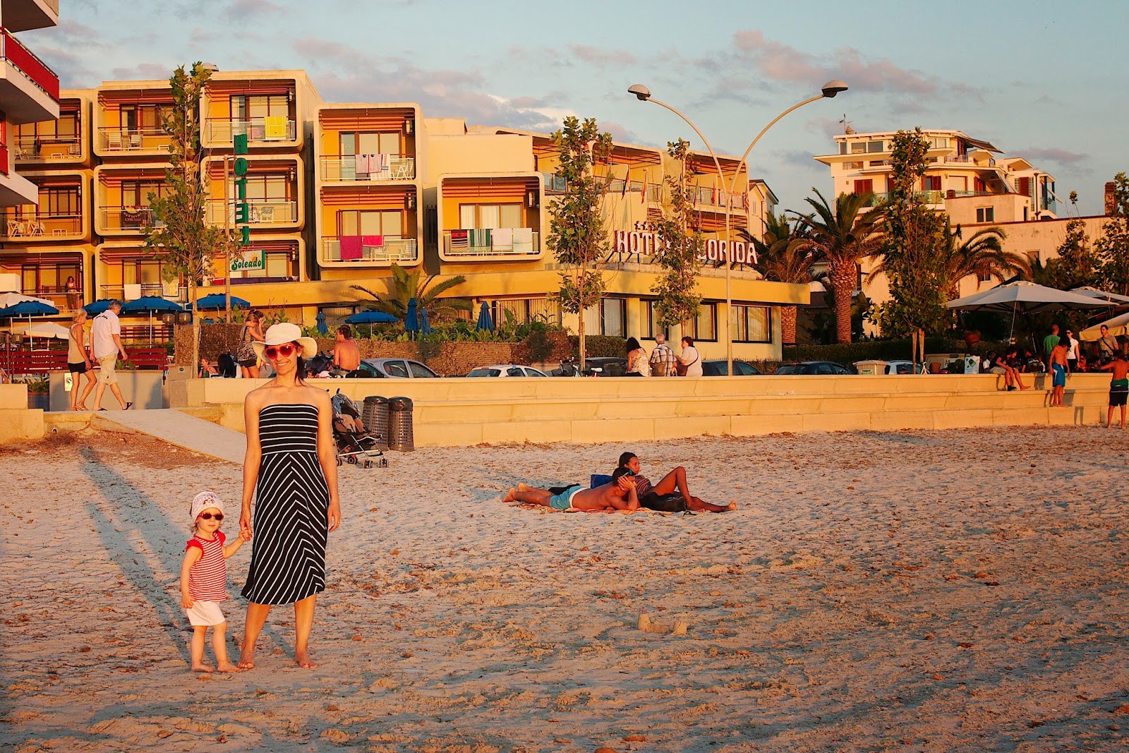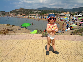 Péntek délelőtt a helyi strandon voltunk, ami tőlünk mindössze pár perc sétára volt. Gyönyörű homokos part, finom langyos víz és mindez ingyen. Sokat homokoztunk és úsztunk (Nóri csak a bokáig érő vízben :) Este vacsora után elmentünk sétálni és Nórinak annyira tetszett a tengerpart, hogy ismét arra vetttük az irányt. Megnéztük a naplementét, aztán mentünk is haza pihenni.