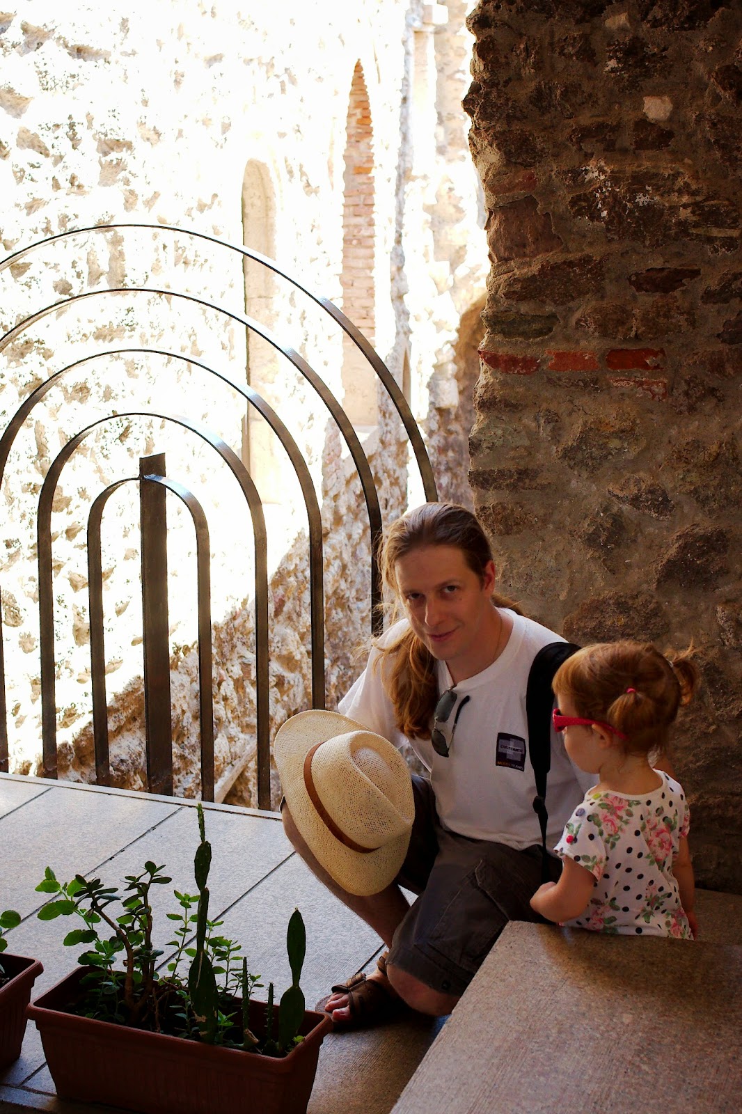 Miután Nóri felébredt, evett egy kis gyümölcsöt (a meleg miatt nem volt valami nagy az étvágya), majd felmentünk a várhoz. Itt majdnem egy órát mászkáltunk, bejártuk a várfalat és a kertet is.