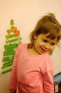 Készítettünk Nórival papírból karácsonyfákat. Nagyon élvezte a ragasztást és persze imádta a fa feldíszítését!