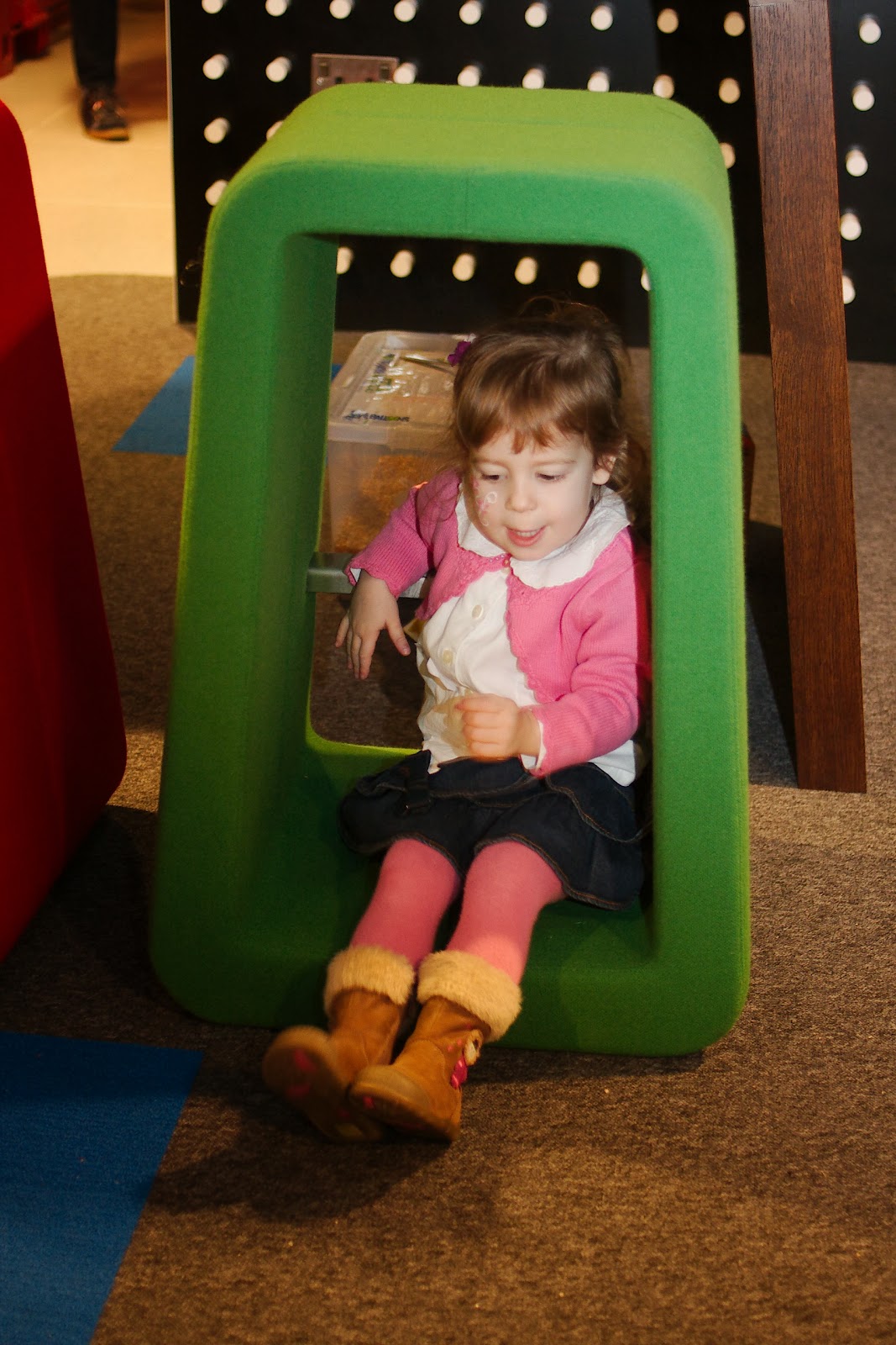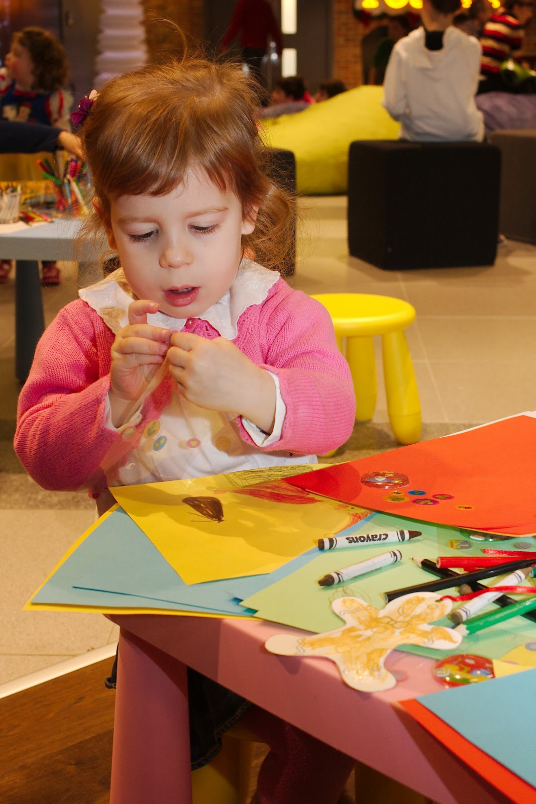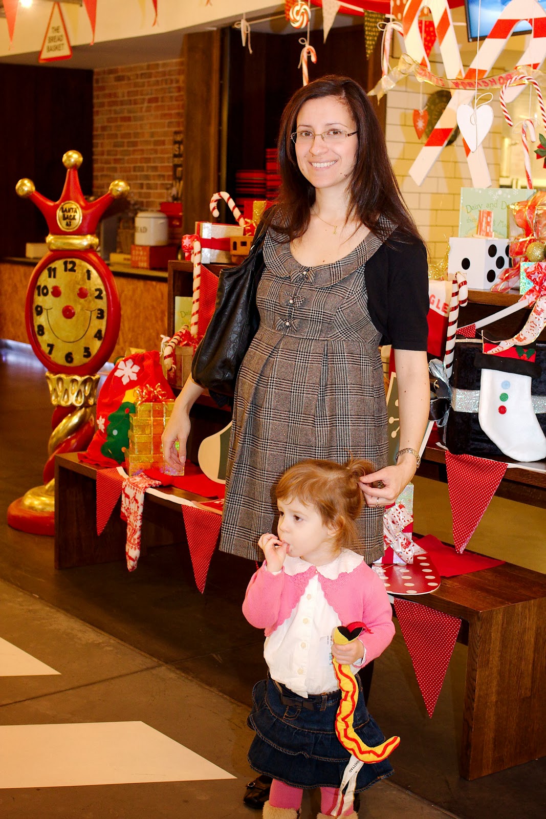 A rendezvény egyik legnagyobb negatívuma talán ez volt. Mármint nem maga a sorbanállás, hanem hogy a sor az utcán tekergett és elég szeles, hideg idő volt. Kb. 10 perc alatt azért beértünk a fedett irodába és még kb. 5 perc volt mire sorra kerültünk. Volt ruhatár, babakocsi tárolóhely és Nóri kapott egy matricát, amin rajta volt a neve, Balázs neve és telefonszáma (ha esetleg elveszítjük, a rendezők könnyen megtalálhassanak minket). A rendezvény díszletei ismét hozták a tavalyi színvonalat. Szuper díszletek és programok voltak. Minden korosztályra gondoltak. A legkisebbeknek volt elkerített rész, ahova a földre is le lehetett enni a még csak mászni tudó gyerekeket. Itt volt nagy színes szőnyeg, habtapi, sok-sok színes, csörgős babajáték, bébikomp, nagy legók, plüssök. Volt a földszinten egy ugrálóvár a nagyobbaknak. Egy nagy kézműves rész, ahol lehetett készíteni karácsonyi pólokat, csizmákat, télapó sapkát. Volt rengeteg papír, matrica, ragasztó, színes filc, ceruza, lehetett csak simán papírra rajzolni. De voltak mézeskalácsok, amiket fel lehetett díszíteni cukorkákkal, gyöngyökkel, csokikkal. Volt egy animátor, aki a nagy gyerekeket szórakoztatta mesékkel és különböző interaktív műsorokkal. Ezen a szinten volt a svédasztalos büfé sok-sok szendviccsel (baguette, kenyér, tortilla) és kisebb harapnivalókkal (pici sültkolbász, sültkrmpli, krumplis omlett), volt sokféle gyümölcs, csokik halmokban, üdítők. De volt pl. egy cukorka-árus pult is mindenféle cukorkával: gumicukor, savanyú, töltött, pille stb. Volt kicsi dobozokban popcorn is. Szóval tényleg minden, ami szem-szájnak ingere.