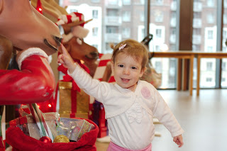 De az égiek kegyesek voltak hozzánk és délután elállt az eső. Sőt! A szél is elcsendesedett, így Nóri délutáni alvása után kimenütnk kicsit sétálni. Igazából vásárolnunk is kellett. Nem jutottunk messzire, egész pontosan a liftig, ugyanis nem működött a lift. Egy totyogóval és babakocsival nekiindulva ez egy pöti problem volt. Visszacsattogtunk a lakásba, de mondtam, hogy ha már végre nincs eső, akkor engem egy ilyen kis akadály, mint a liftnélküliség, bizony nem tántorít el attól, hogy nyakamba vagyem a várost (azaz azt a két utcát, amin mennünk kell, hogy a Tesco-ig eljussunk). Szóval egy kis átrendezés után ismét nekivágtunk utunknak. Gondolkodtam, hogy így gyalogosan csak a közelebbi bevásárló központba megyünk, de megláttam, hogy néhány kis bódé már kinyitott a karácsonyi vásárban és van élő betlehemes is. Ez nagyon csábított, így a Tesco felé vettük az irányt. Nóri persze az első árusnál megállt. Ugyanis ki voltak rakva kicsi gumilovak, olyanok, amilyen itthon is van neki. Nagyon megörült neki. Hagytam, hogy az egyikre felüljön, az árus szemmel láthatóan nem bánta. De pár perc után mondtam Nórinak, hogy mennünk kell, köszönjön el a pacitól. Nóri erre megölelte és adott neki egy nagy puszit. Én olvadoztam, hogy milyen cuki-édes-kedves-okos kislányom van. Majd odébb álltunk.