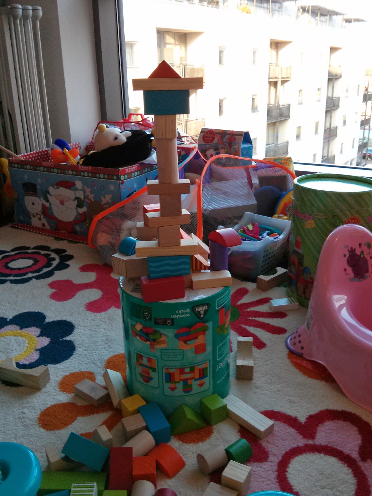 Építőkockákkal játszik. Épít egy nagy tornyot, megdicsérem: "De szép házat építettél!" Mire Norci: "Az nem ház, hanem palota!" - Ja, bocsánat!