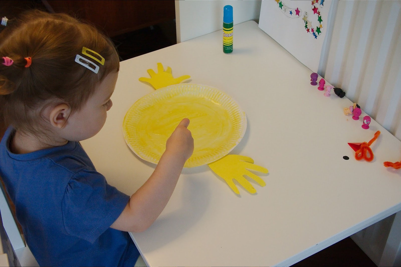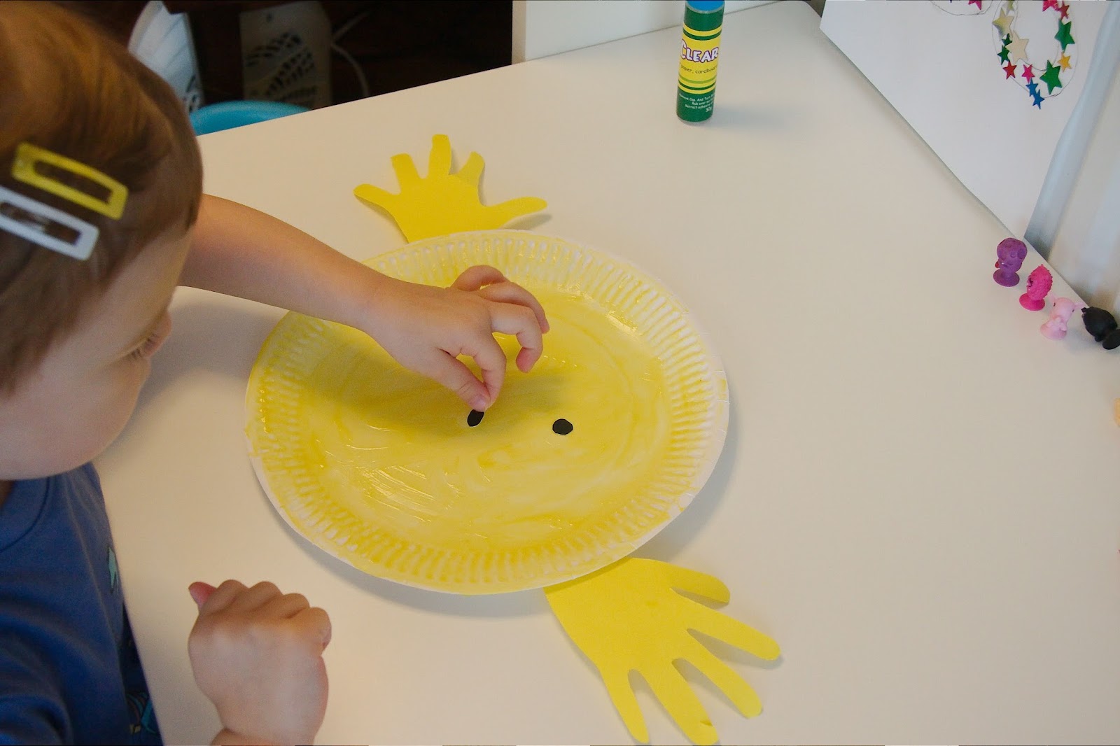 Nóri feltette a csibe szemeit és a csőrét (ehhez nem kell ragasztó, a papír jól tapad az ujjfestékre). Végül megformáztam a zseníliadrótokat és rögzítettem a tányérhoz.